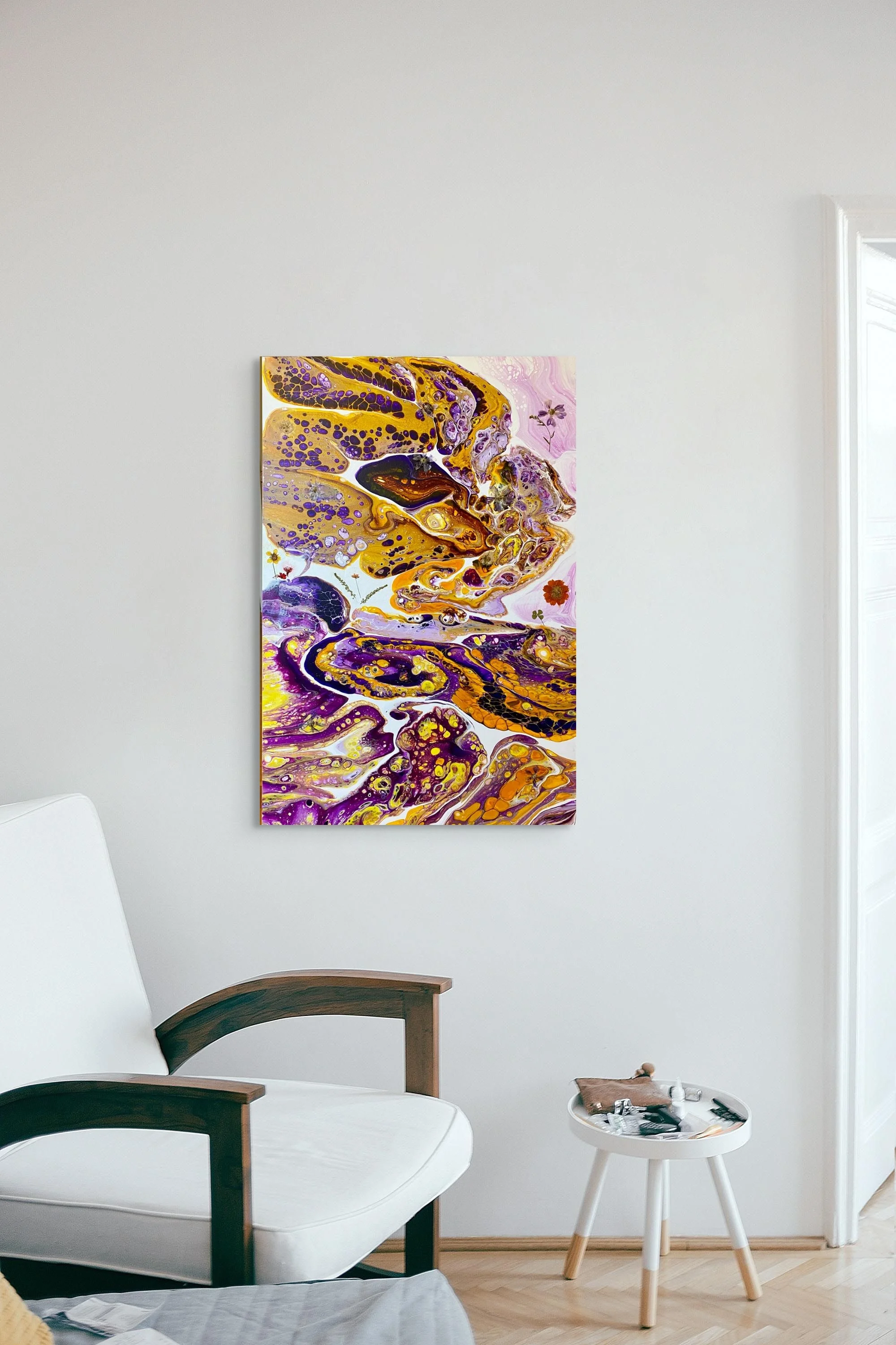 Transform your space with this enchanting painting. Crafted with vibrant acrylics layered and poured onto canvas and accentuated by delicate dried flowers. This unique piece invites you to experience magic and strength in every layer.