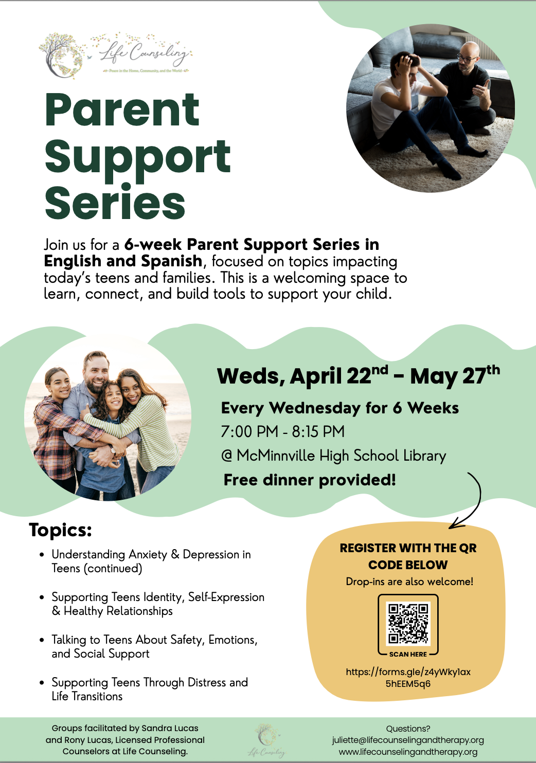 Life Counseling is excited to continue offering Parent Support with a free 6-week series in both Spanish and English, led by Licensed Professional Counselors Sandra Lucas and Rony Lucas. This series is designed to provide parents and guardians with practical tools, guidance, and focused support on topics affecting today’s teens and families. It is a welcoming space to learn, connect, and build strategies to support your child.