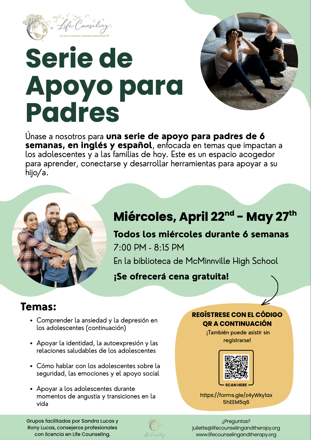 Life Counseling está encantado de continuar ofreciendo Apoyo para Padres con una serie gratuita de 6 semanas, en español e inglés, dirigida por los consejeros profesionales con licencia Sandra Lucas y Rony Lucas. Esta serie está diseñada para brindar a padres y tutores herramientas prácticas, orientación y apoyo enfocado en temas que afectan a los adolescentes y las familias de hoy. Es un espacio acogedor para aprender, conectarse y desarrollar estrategias para apoyar a su hijo/a.